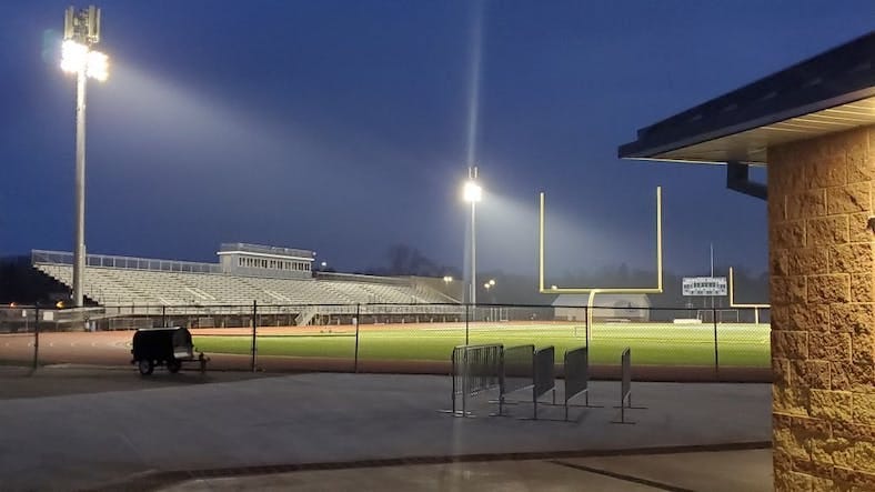 An empty Troy Memorial Stadium at night